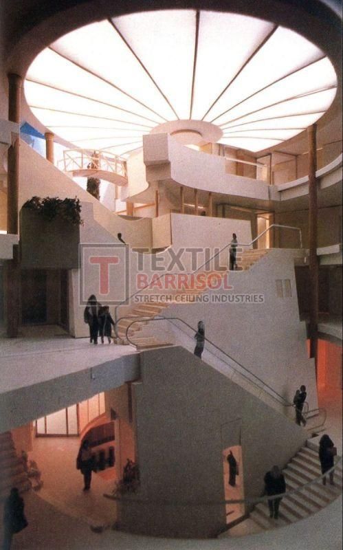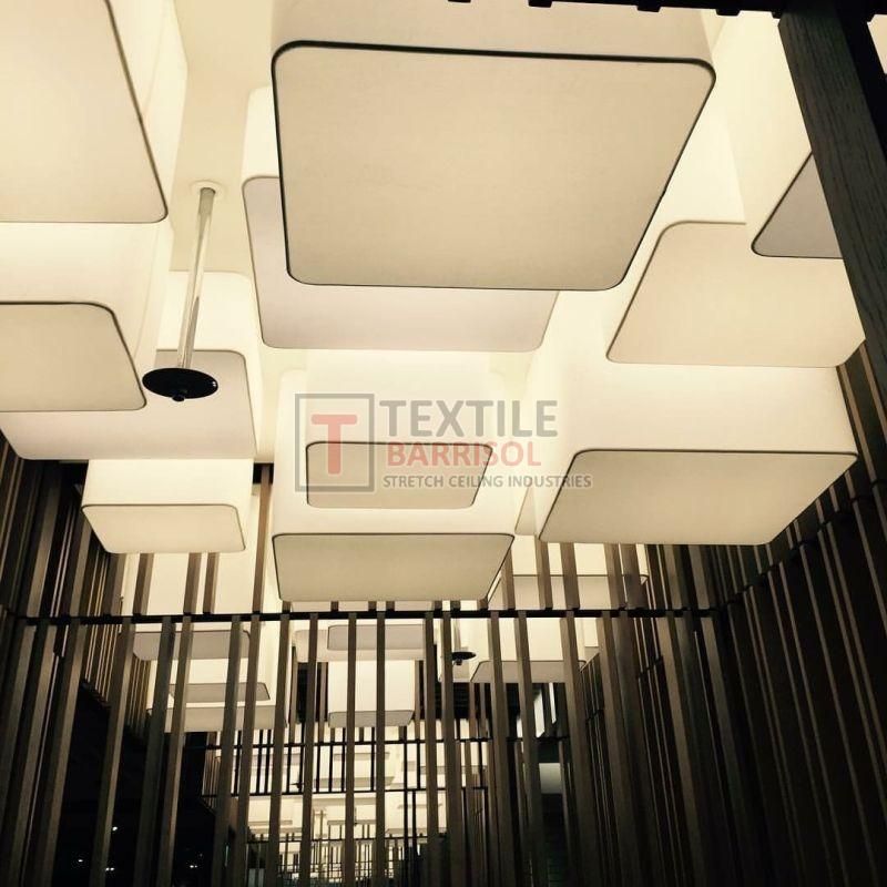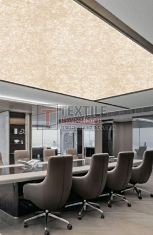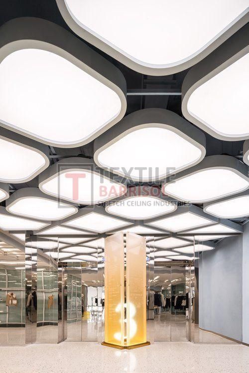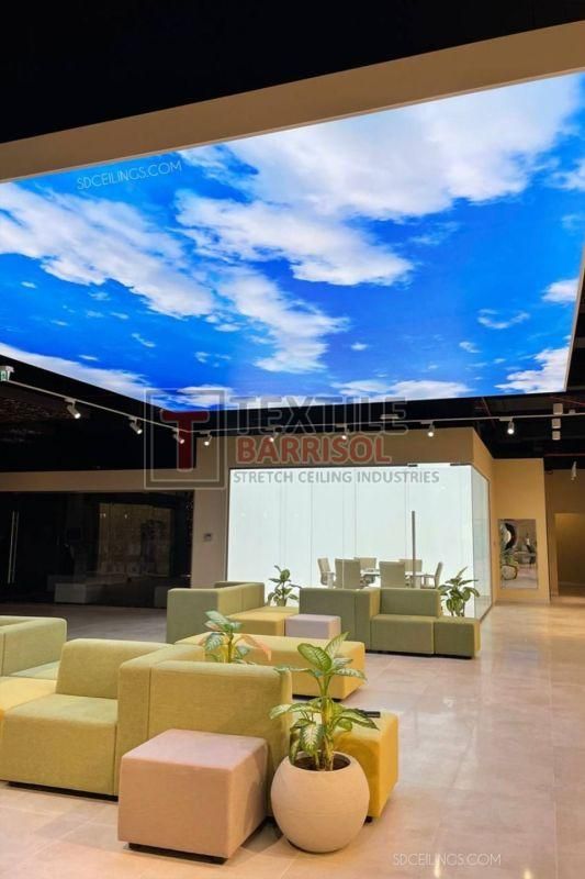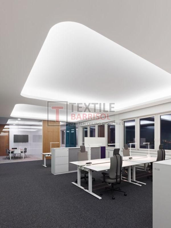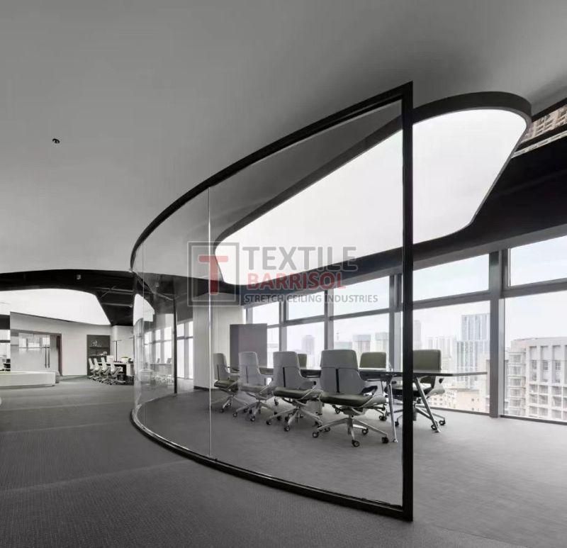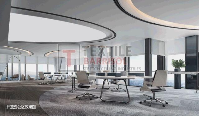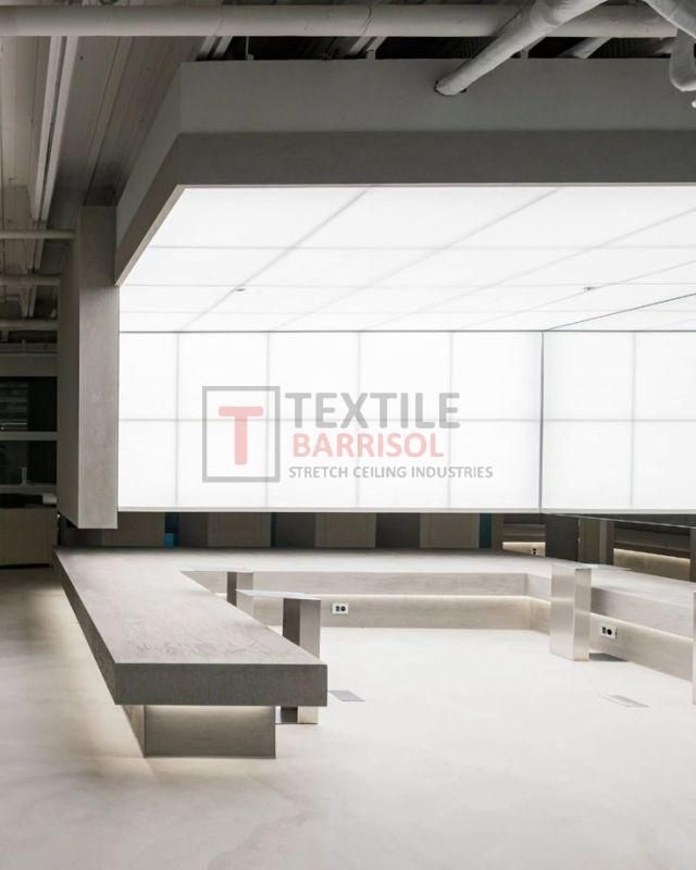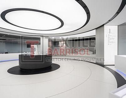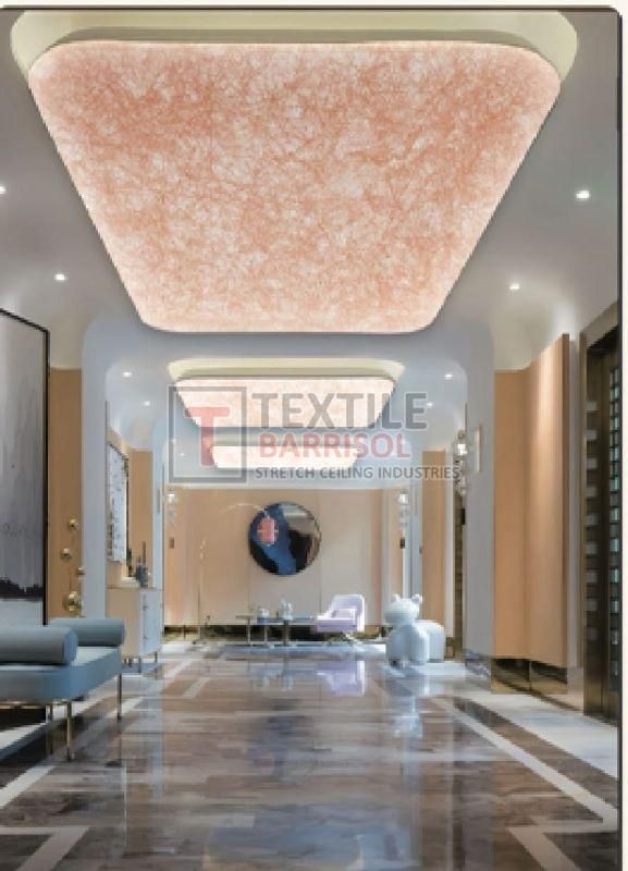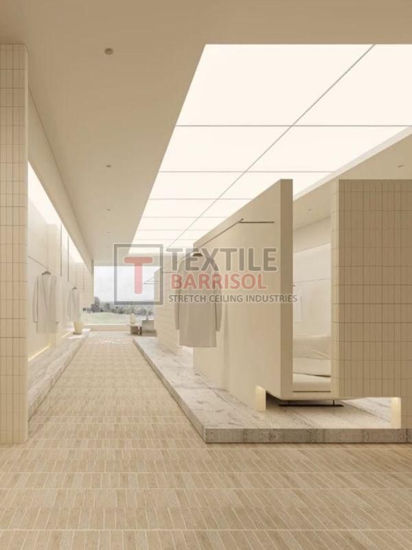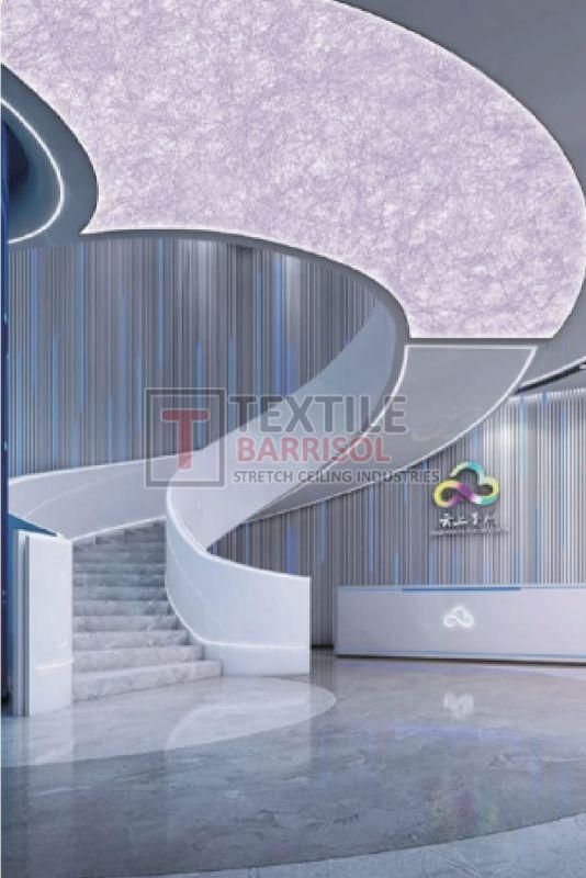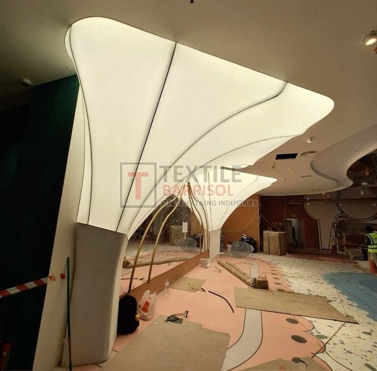 A Textile Commercial Stretch Ceiling is a modern ceiling solution designed for business and commercial spaces such as offices, malls, showrooms, hotels, restaurants, hospitals, auditoriums, gyms, and airports. It is made from a PVC or polyester fabric membrane stretched on a lightweight aluminum profile, offering both aesthetic appeal and functional benefits.