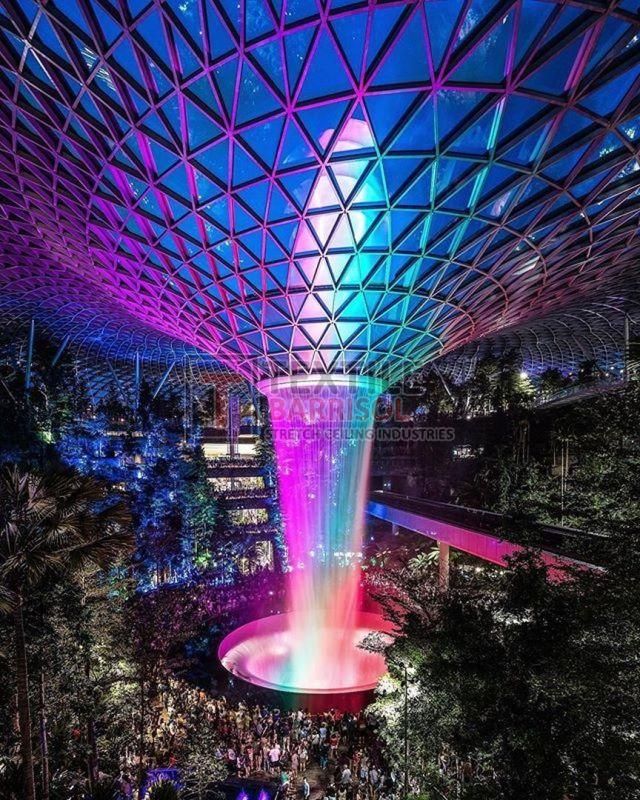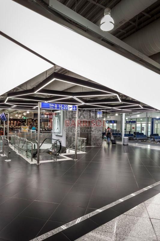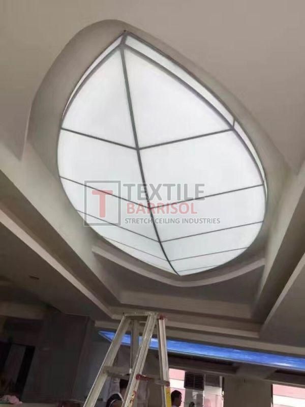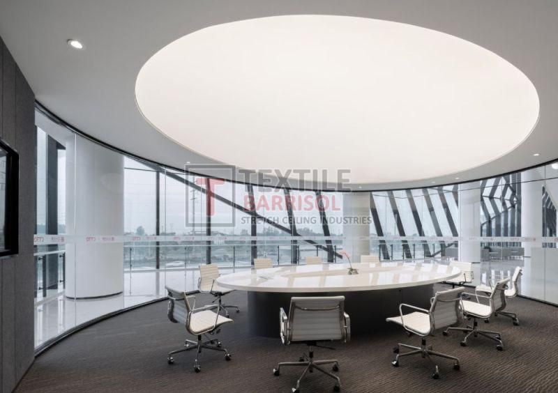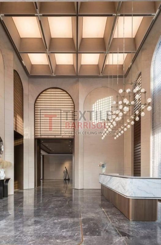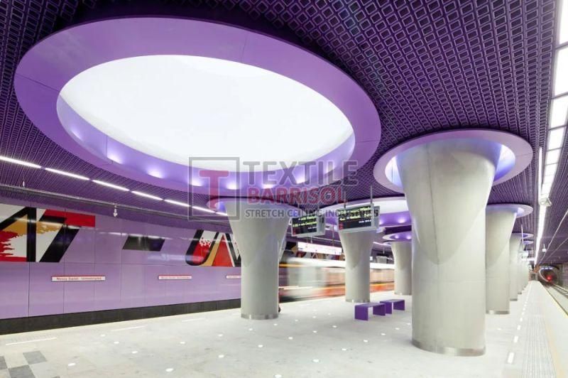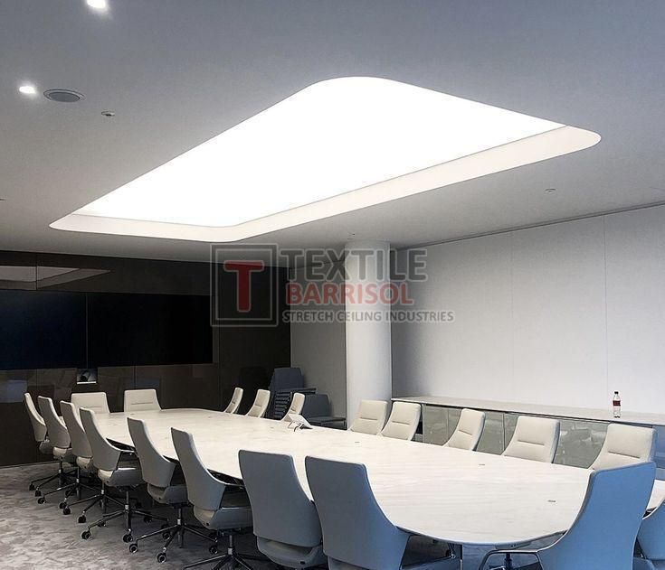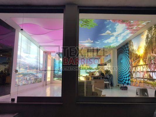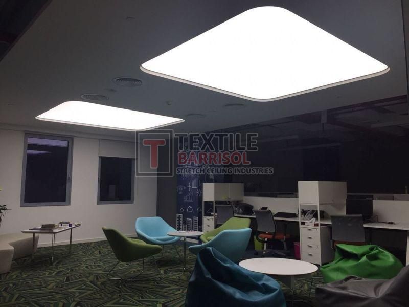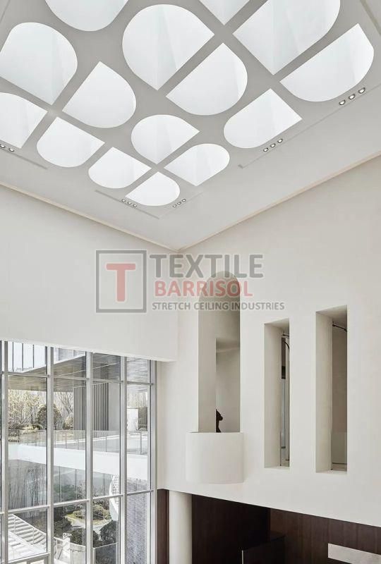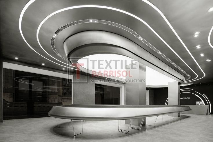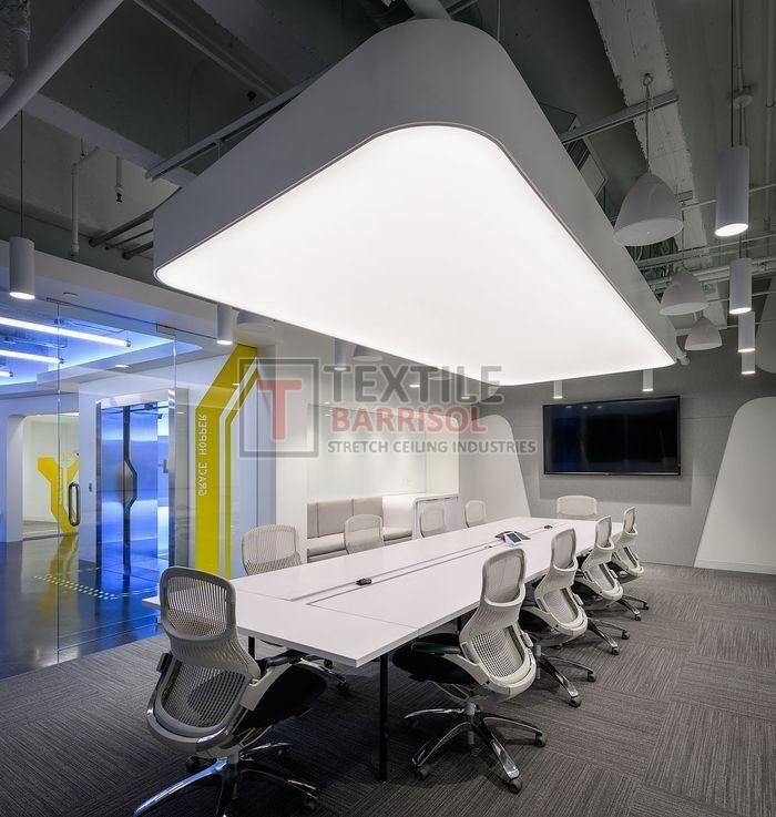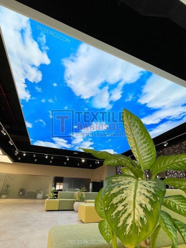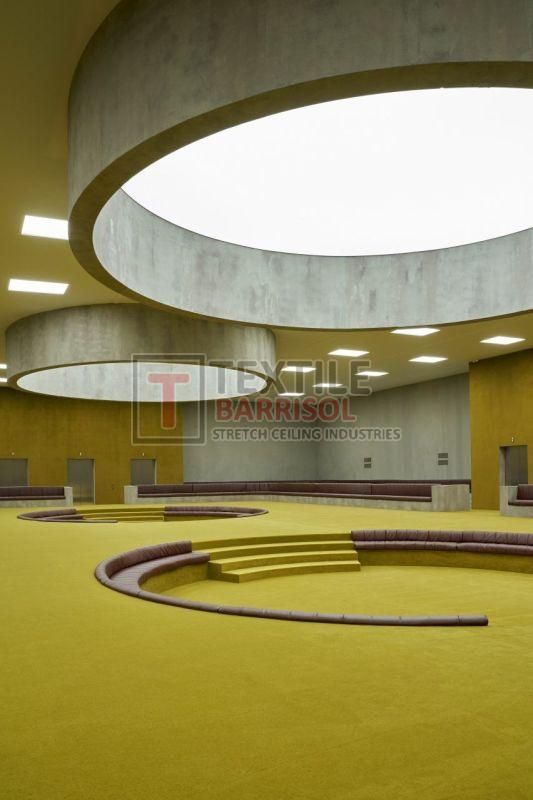 A Textile Commercial Stretch Ceiling is a modern ceiling solution designed for business and commercial spaces such as offices, malls, showrooms, hotels, restaurants, hospitals, auditoriums, gyms, and airports. It is made from a PVC or polyester fabric membrane stretched on a lightweight aluminum profile, offering both aesthetic appeal and functional benefits.