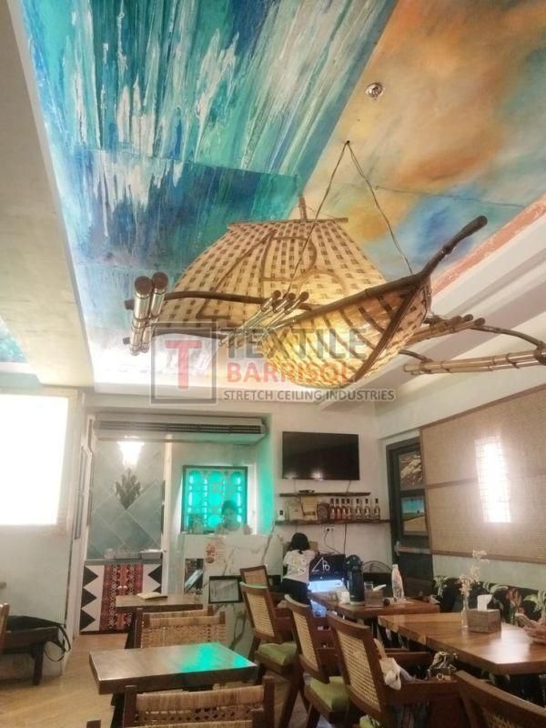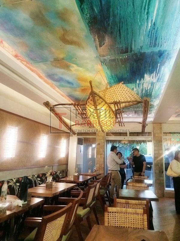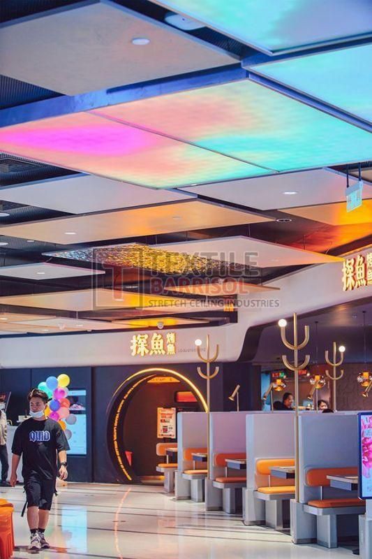 A Textile Café Stretch Ceiling is a modern ceiling solution specially designed for restaurants, coffee shops, and lounges to create an attractive, cozy, and functional atmosphere. It uses a PVC or textile membrane stretched on a lightweight aluminum frame, allowing endless design possibilities.