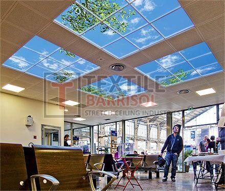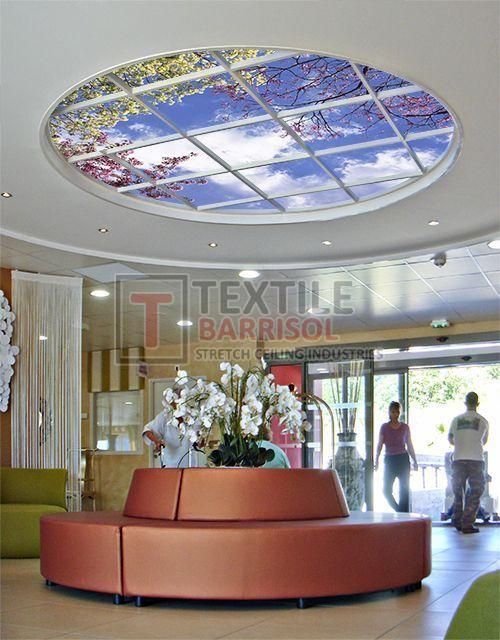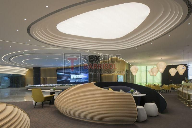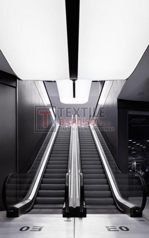 A Textile Commercial Stretch Ceiling is a modern ceiling solution designed for business and commercial spaces such as offices, malls, showrooms, hotels, restaurants, hospitals, auditoriums, gyms, and airports. It is made from a PVC or polyester fabric membrane stretched on a lightweight aluminum profile, offering both aesthetic appeal and functional benefits.