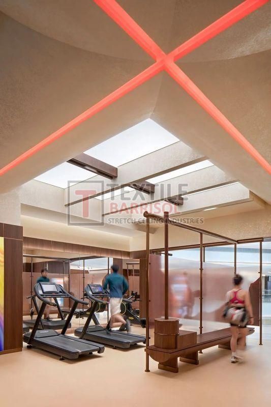 In short, a Textile Gym Stretch Ceiling is a stylish, functional, and durable ceiling system that creates a motivating environment while handling the heavy use and conditions of fitness spaces.